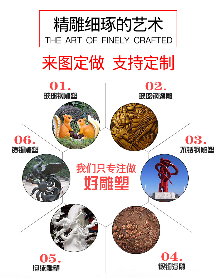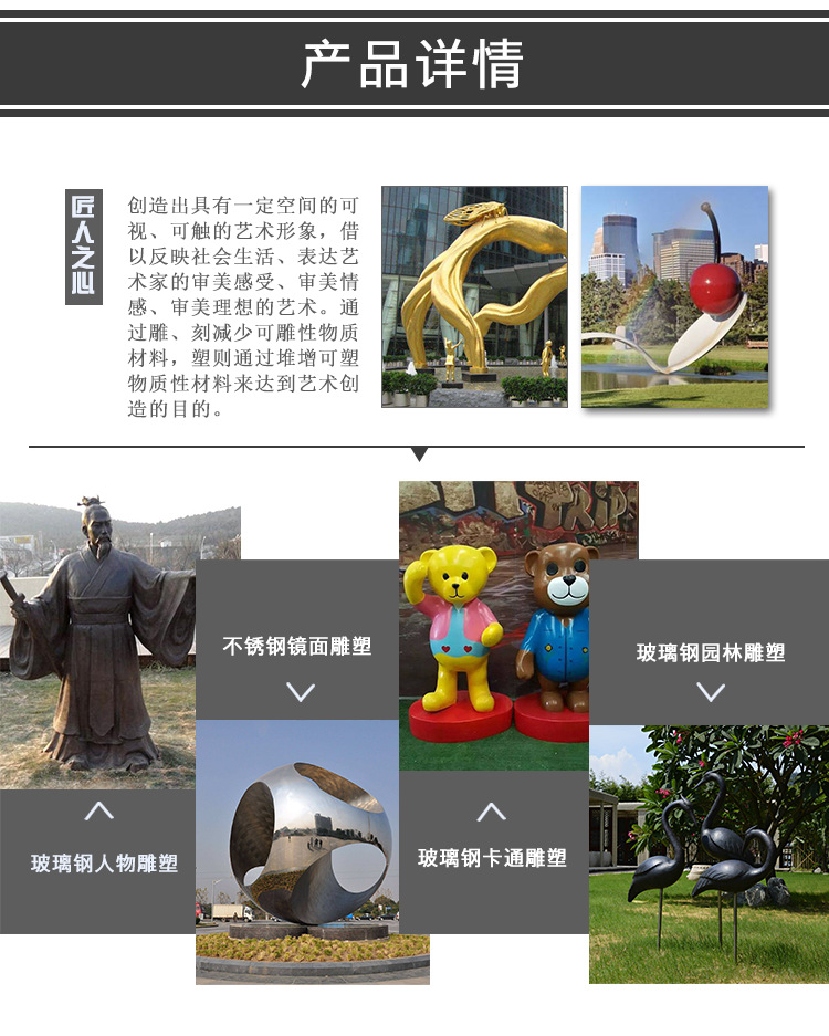 我司产品均为厂家直销,采用优质的玻璃钢树脂材料,表面喷高级汽车漆。产品可用于室内、室外,不怕日晒雨淋,请勿以低价的”氧化镁“材质与之比较。很多厂家为了节约成本,用低价的氧化镁来制作,请各位新老客户留意产品的材料。
